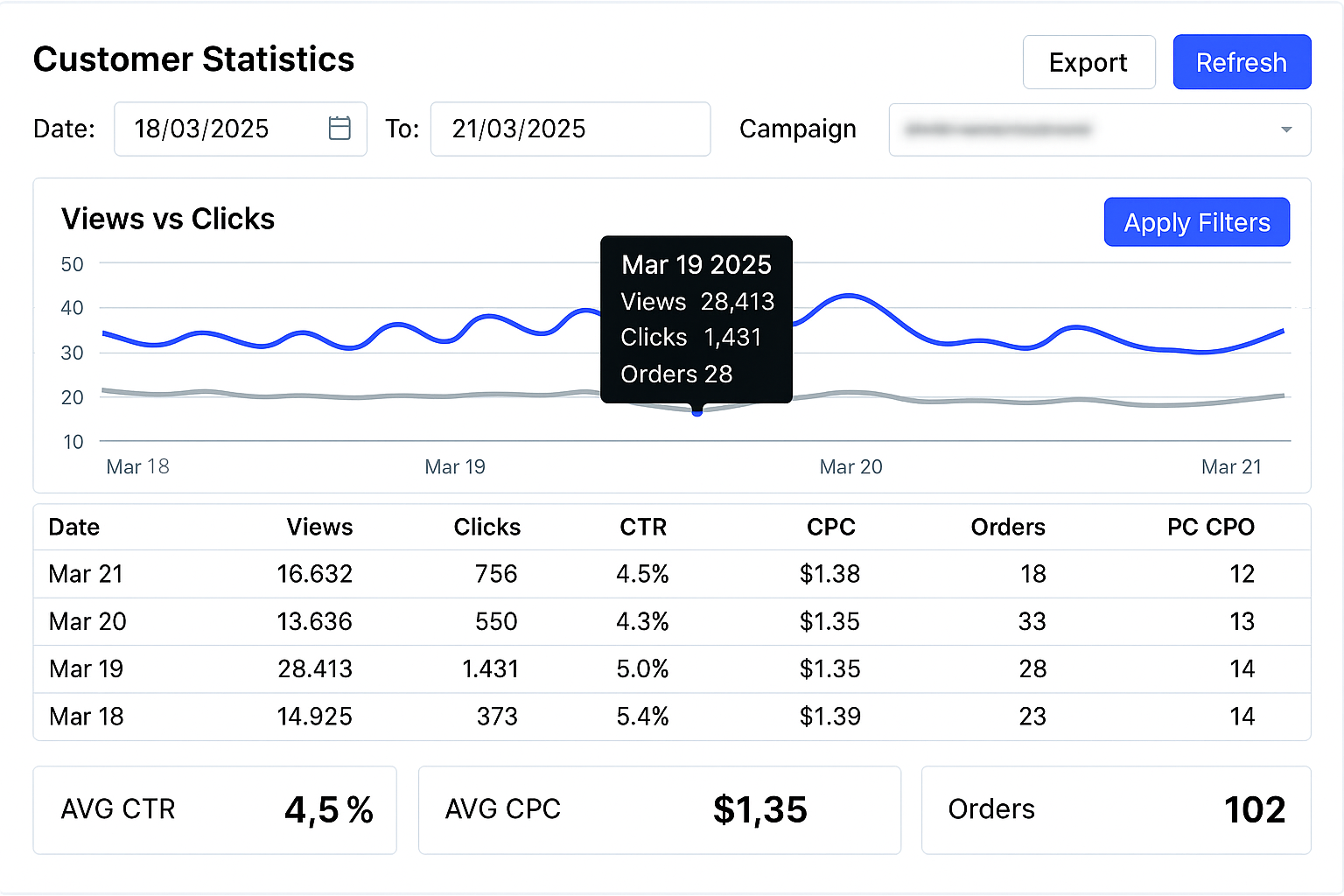 Our platform provides detailed reports with essential metrics like audience reach, conversion rates, ROI, CPC, and more.